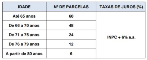 A taxa de juros atual é INPC + 6% a.a, também são cobradas as taxas de Quitação Por Morte (1%) descontada no ato, e a Taxa Administrativa (2%) que é diluída nas parcelas, que podem variar de 01 a 60 meses.