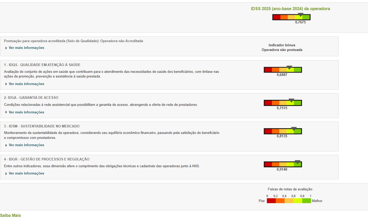 Entre os indicadores analisados, os melhores resultados do plano foram registrados em Sustentabilidade de Mercado, com nota 0,8135, que mede o equilíbrio econômico-financeiro da operadora, a satisfação dos beneficiários e o compromisso com os prestadores, e em Gestão de Processos e Regulação, que obteve 0,9140, indicador que avalia o cumprimento das obrigações técnicas e cadastrais junto à ANS.