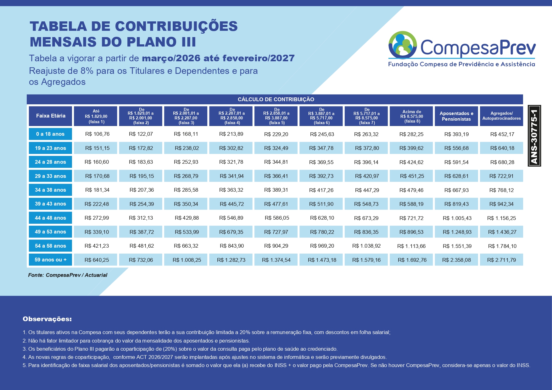 A Fundação Compesa de Previdência e Assistência – CompesaPrev, na qualidade de administradora do Plano de Saúde dos Empregados da Compesa – CompesaSaúde, informa que a partir das mensalidades de competência fevereiro dos Planos de Saúde I, II e III incidirá reajuste de 8%, aprovado na 593ª Reunião do Conselho Deliberativo, de 26 de janeiro de 2026 e no Ofício 01/2026 da patrocinadora Compesa, de 30 de janeiro do mesmo ano.